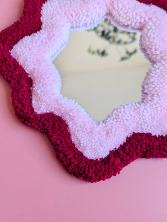 Bright red and pink coloured wavy pattern tufted yarn mirror