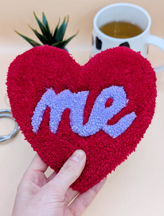 Red love heart shaped coaster with pink ME slogan mini rug mug rug