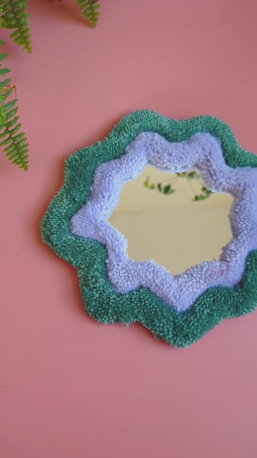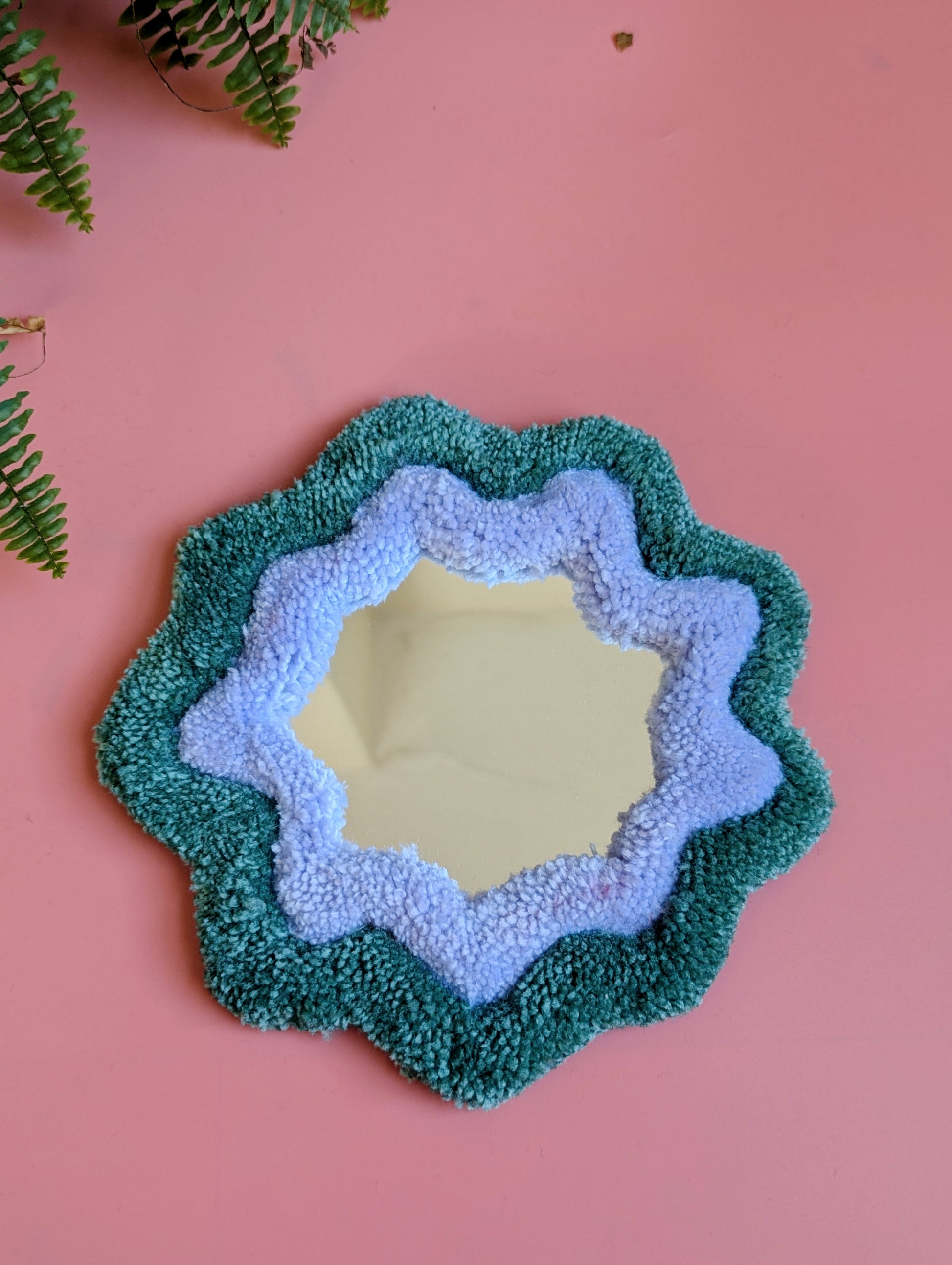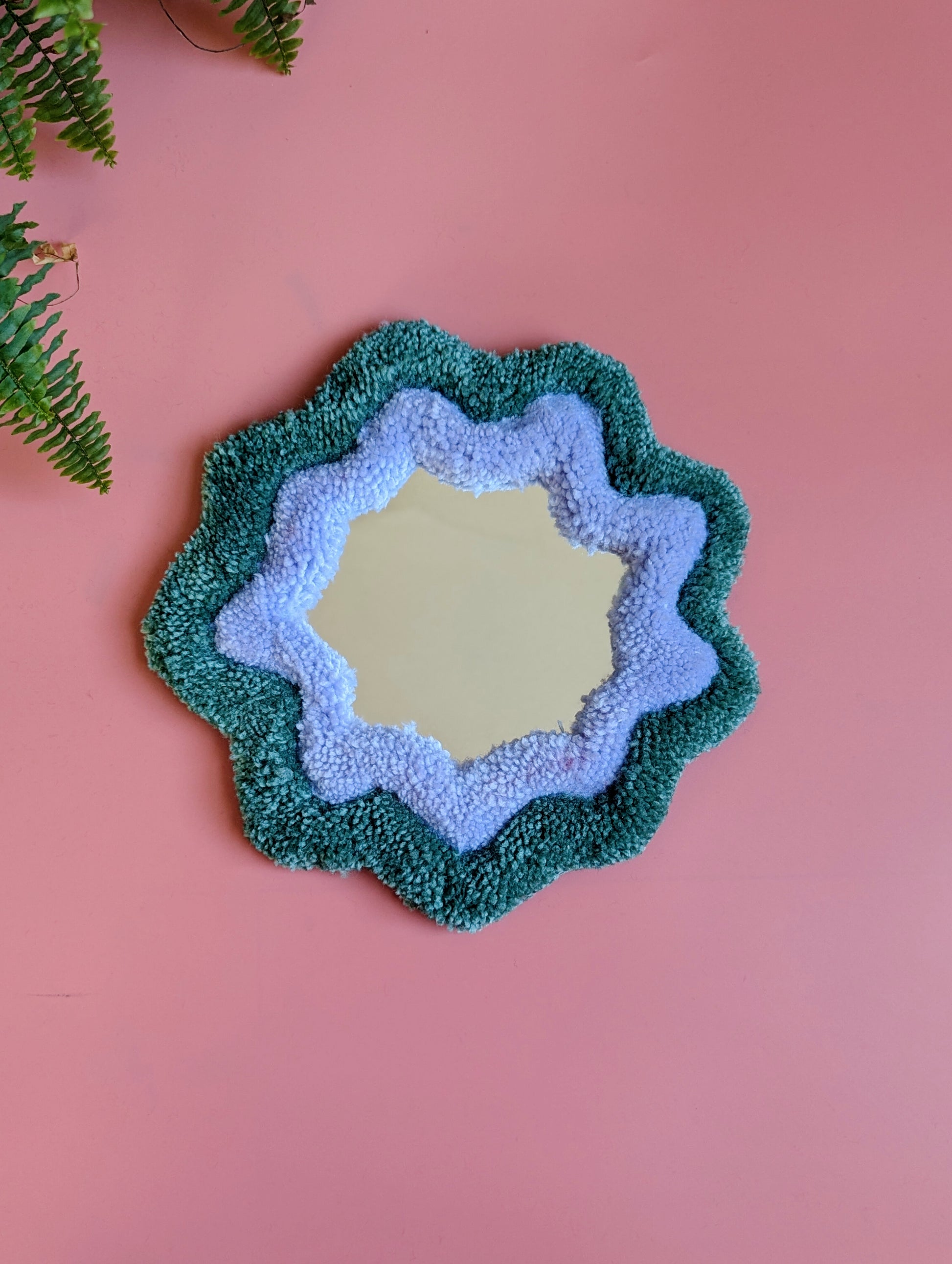 Teal and purple coloured wavy pattern tufted yarn mirror