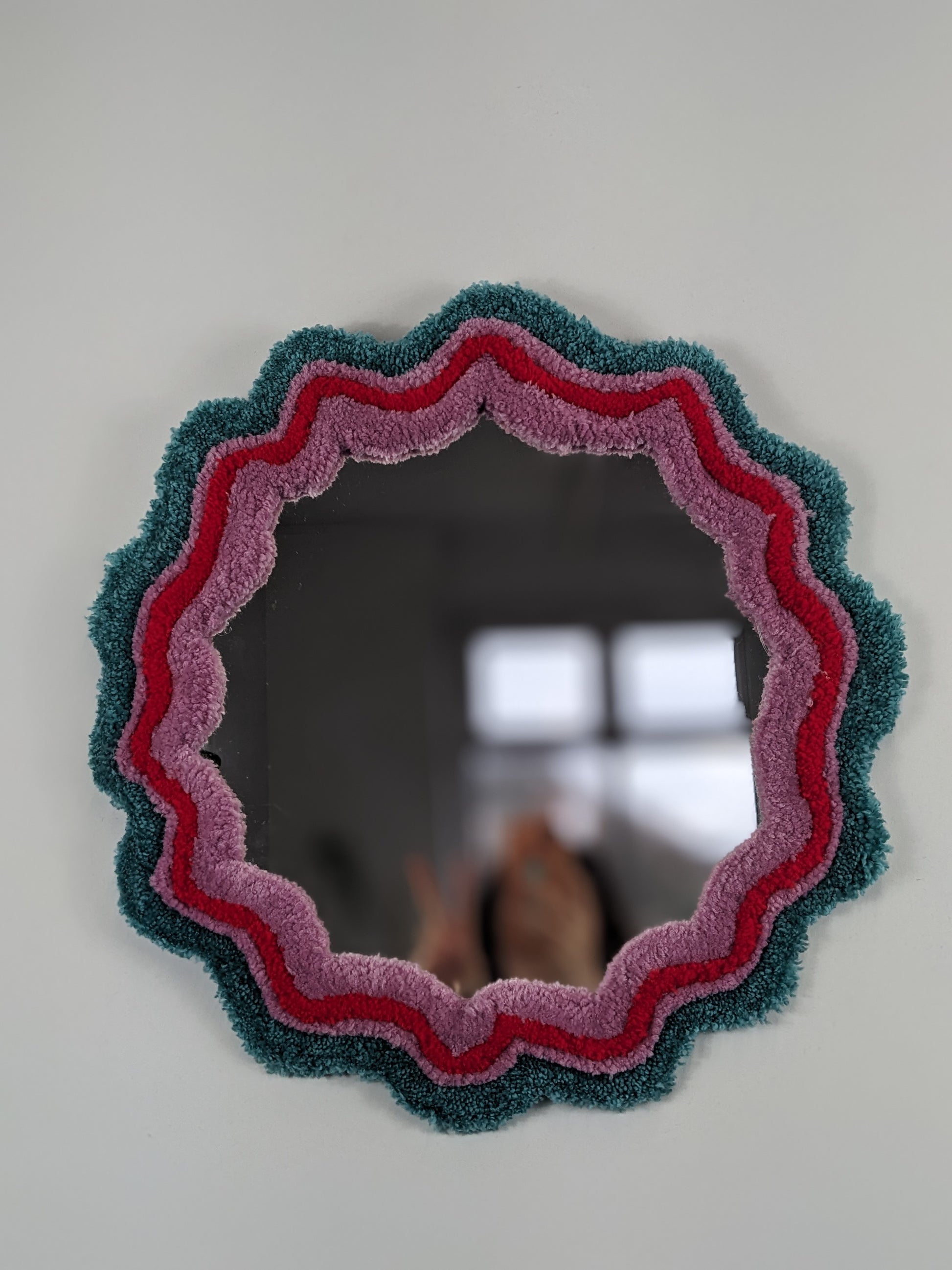 circle red green coloured wavy pattern tufted yarn mirror