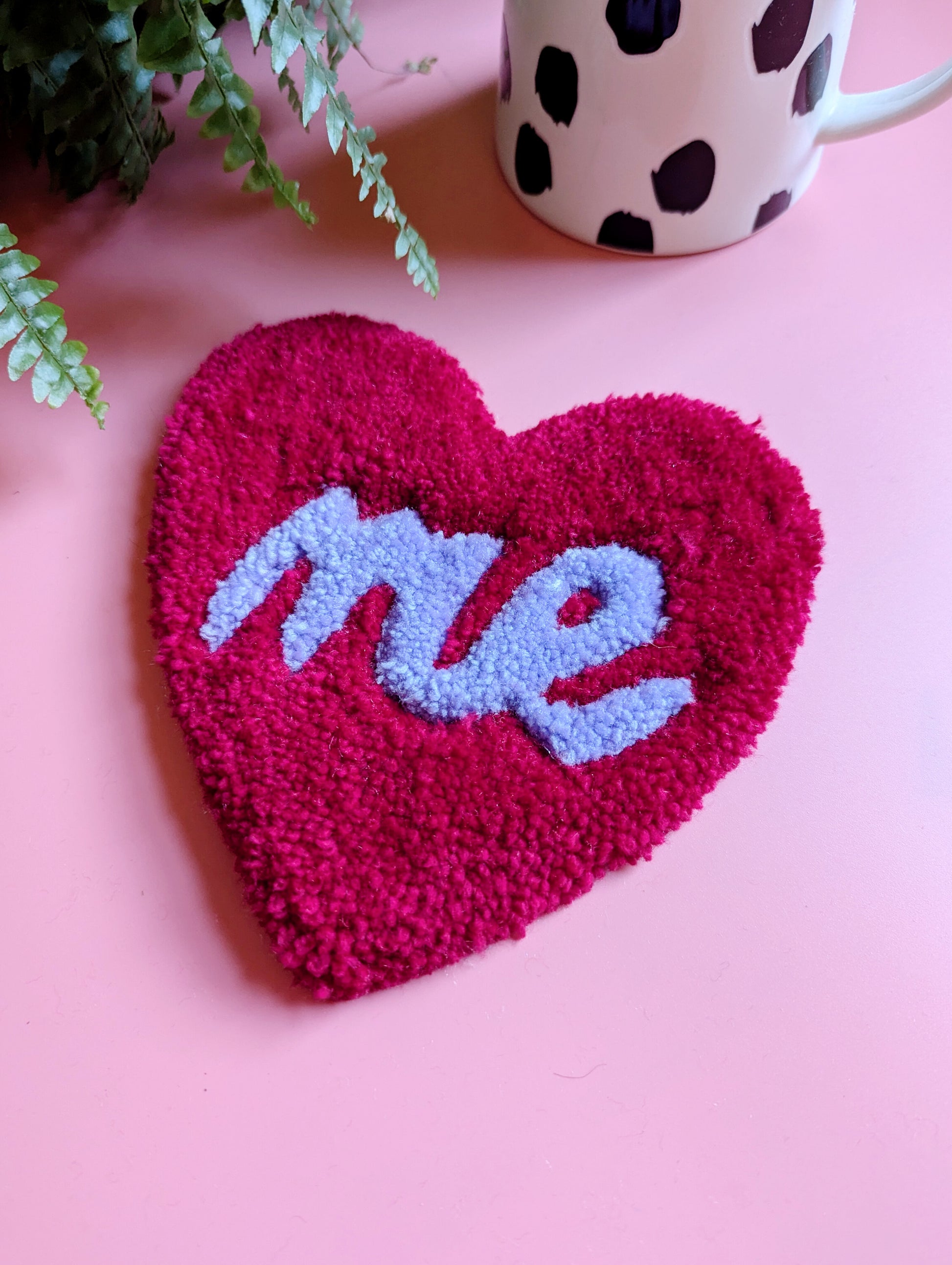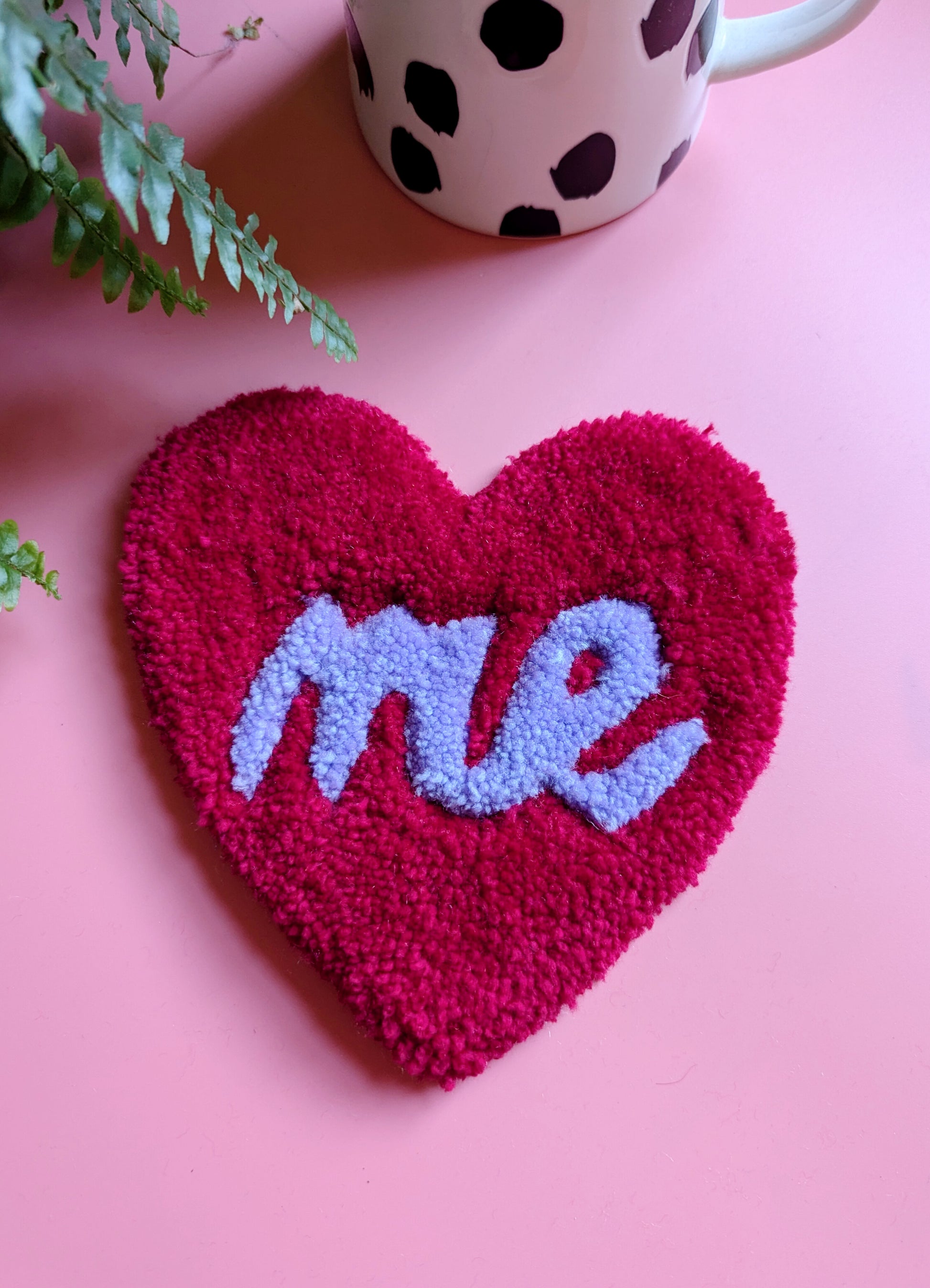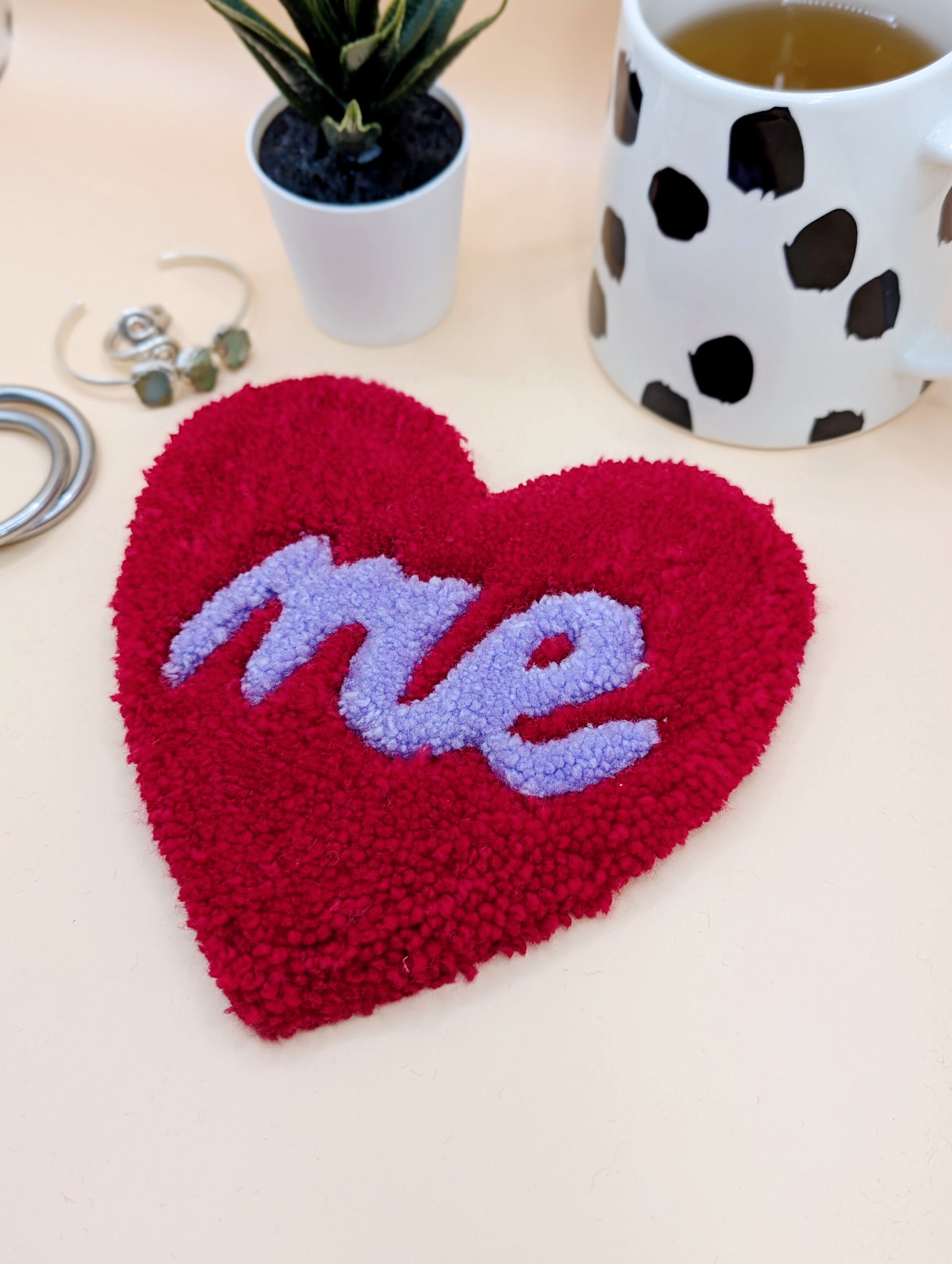 Red love heart shaped coaster with purple ME slogan mini rug mug rug