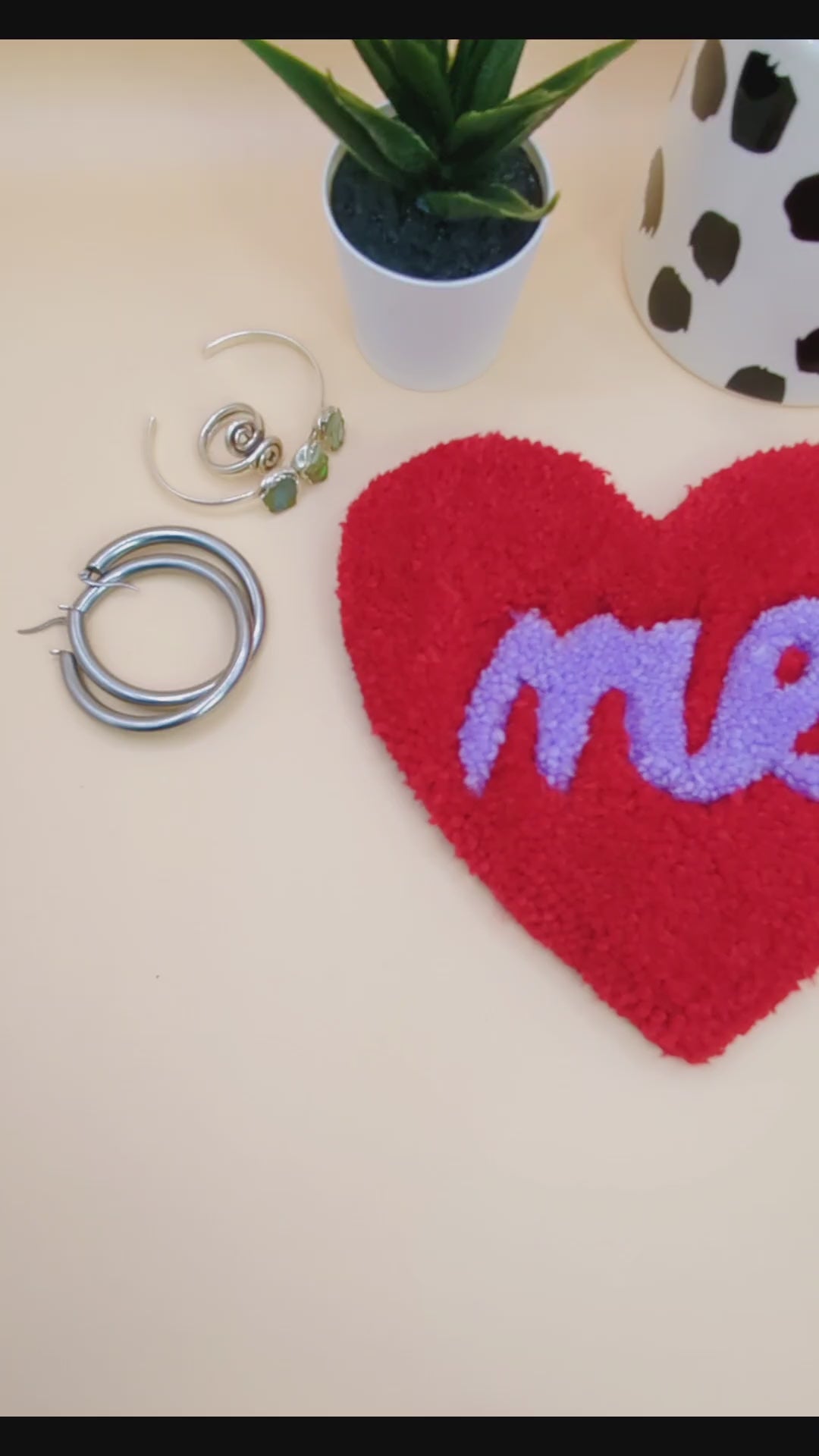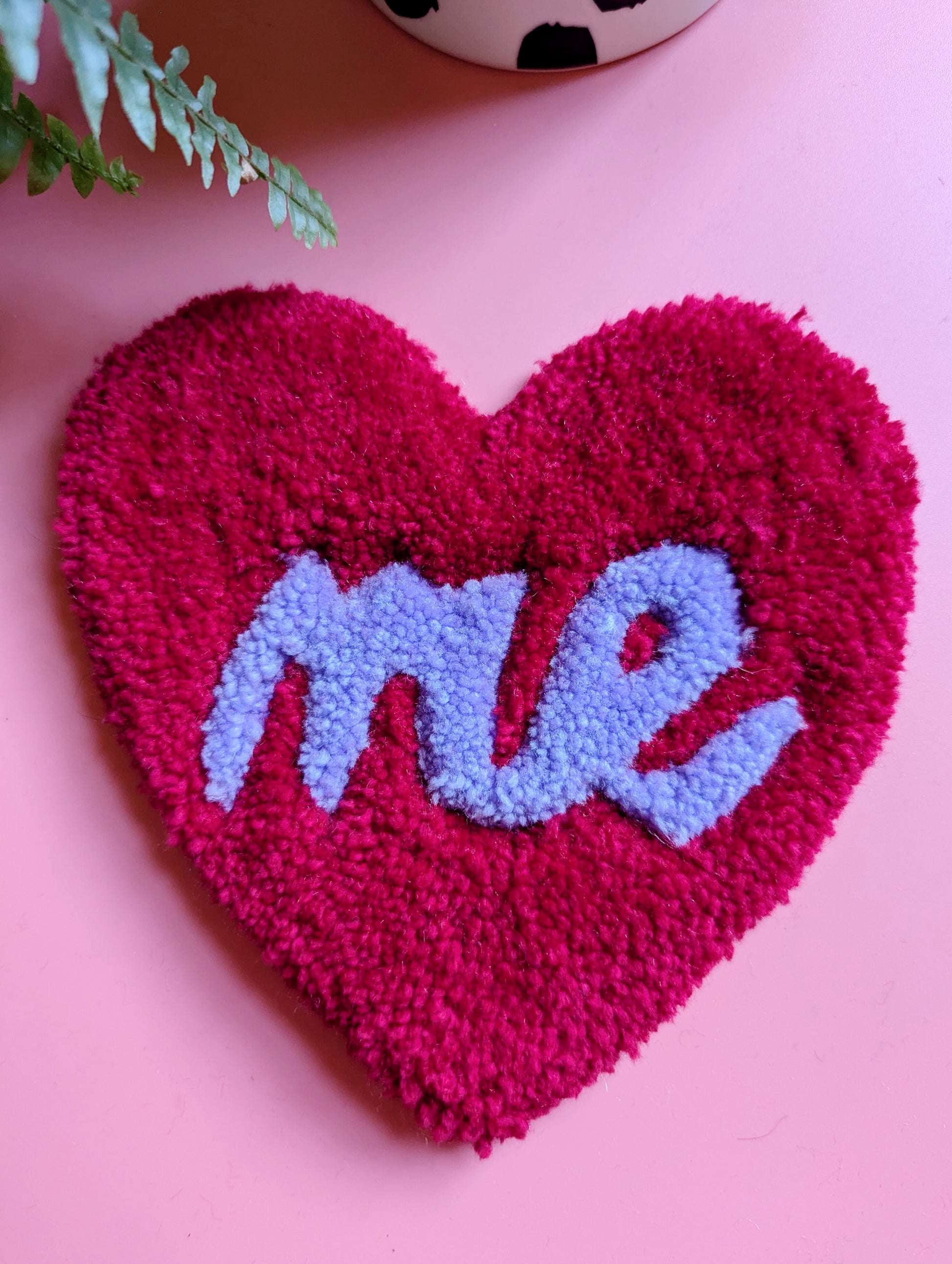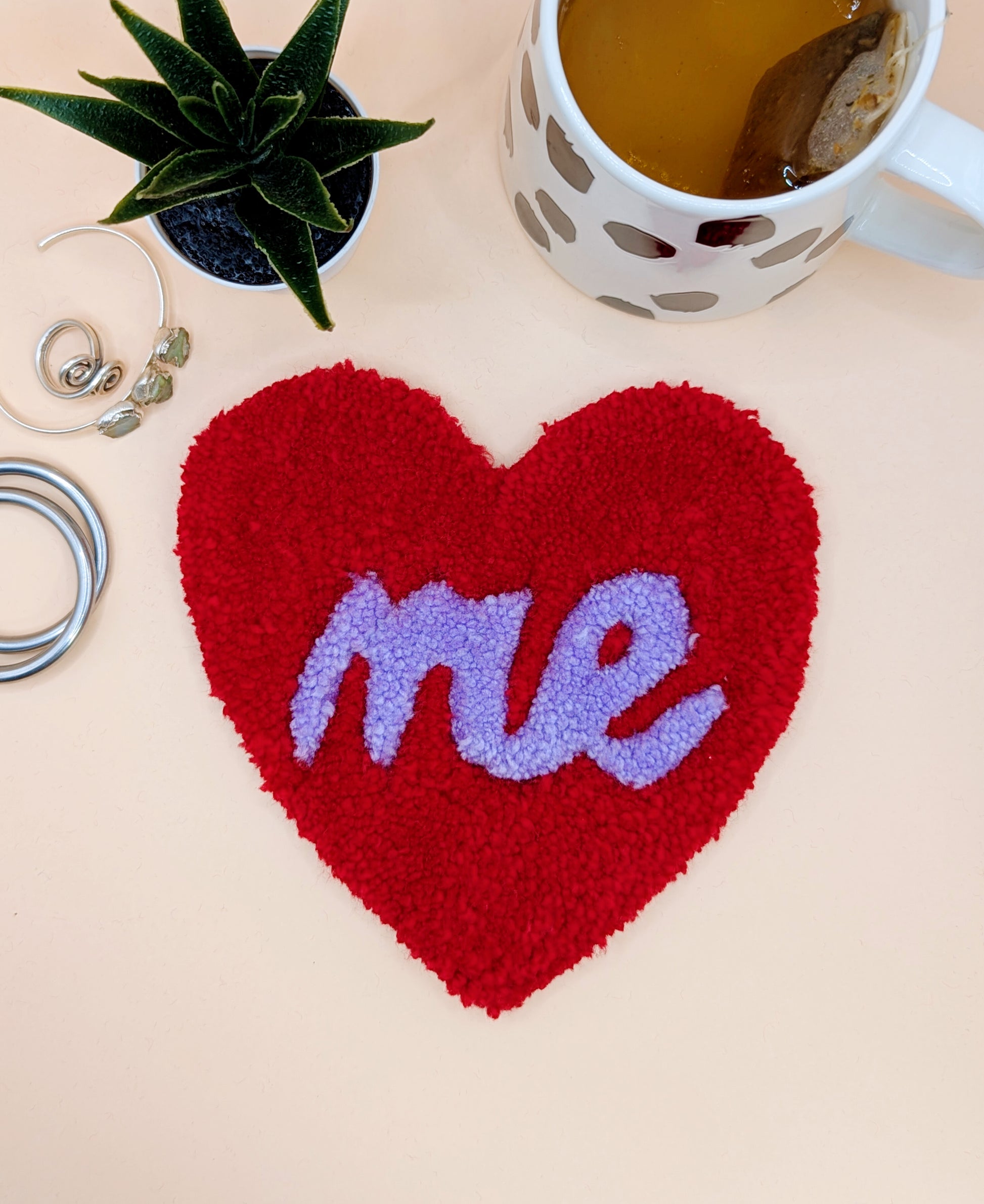 Red love heart shaped coaster with purple ME slogan mini rug mug rug