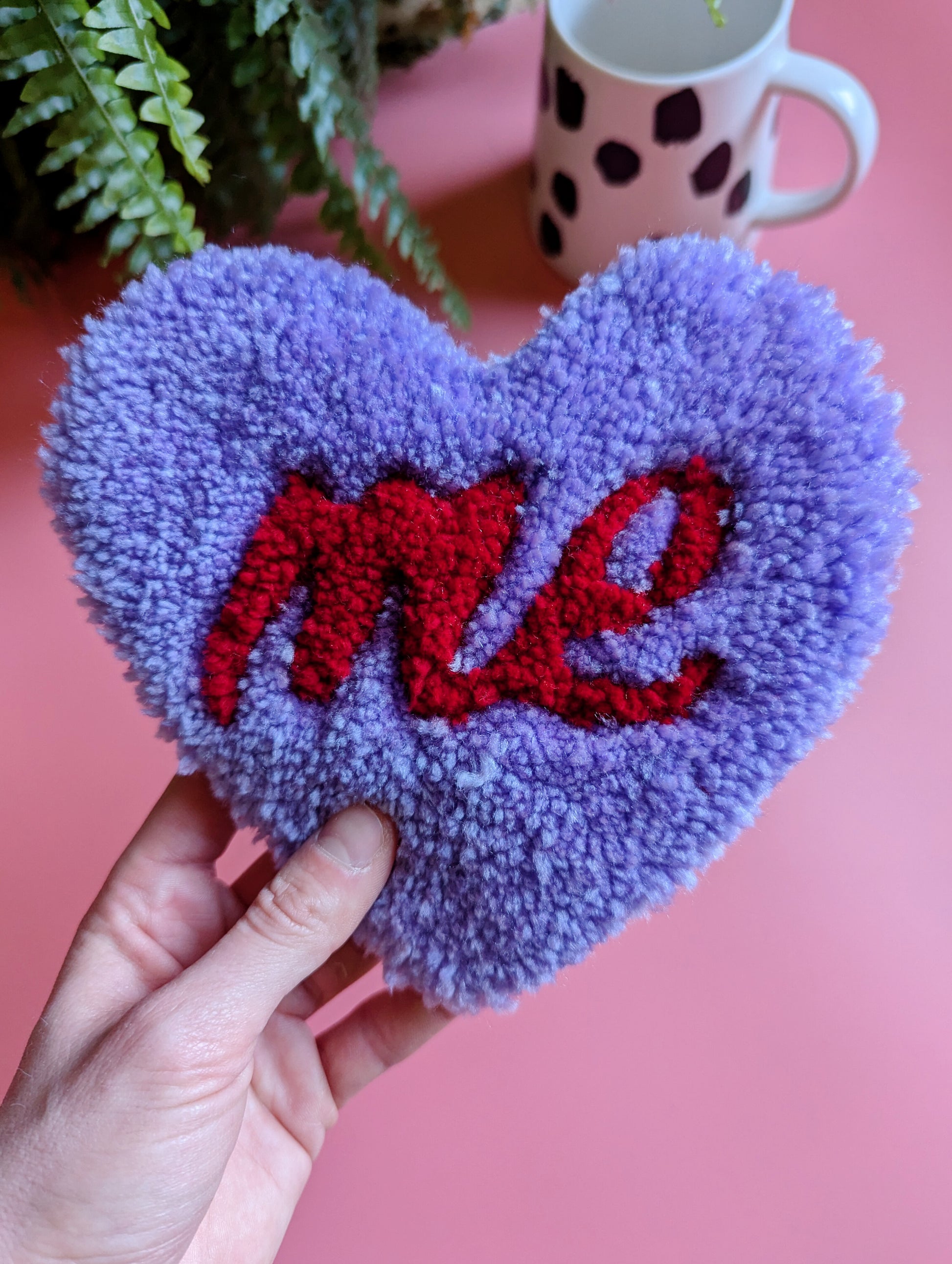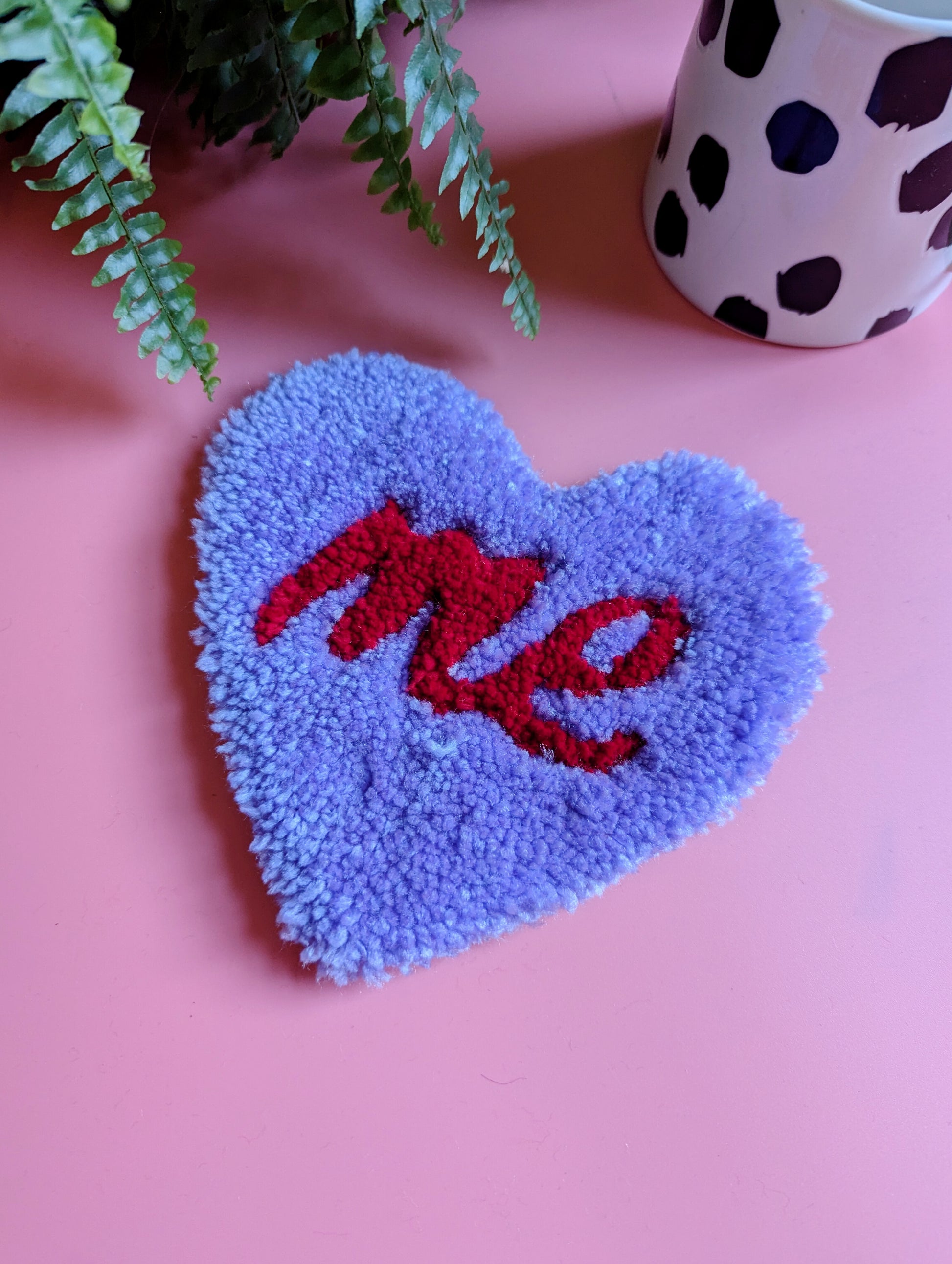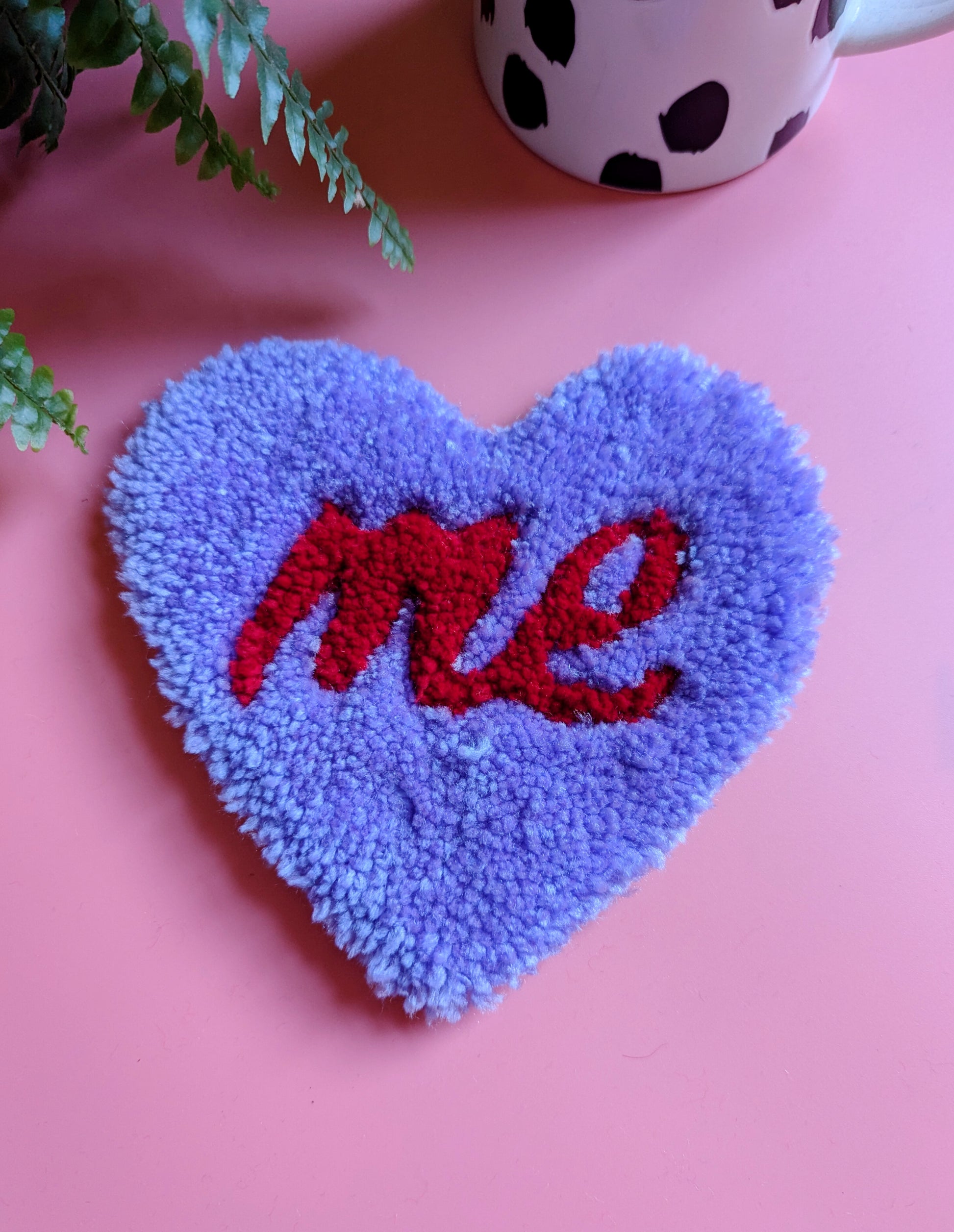 Purple love heart shaped coaster with red ME slogan mini rug mug rug