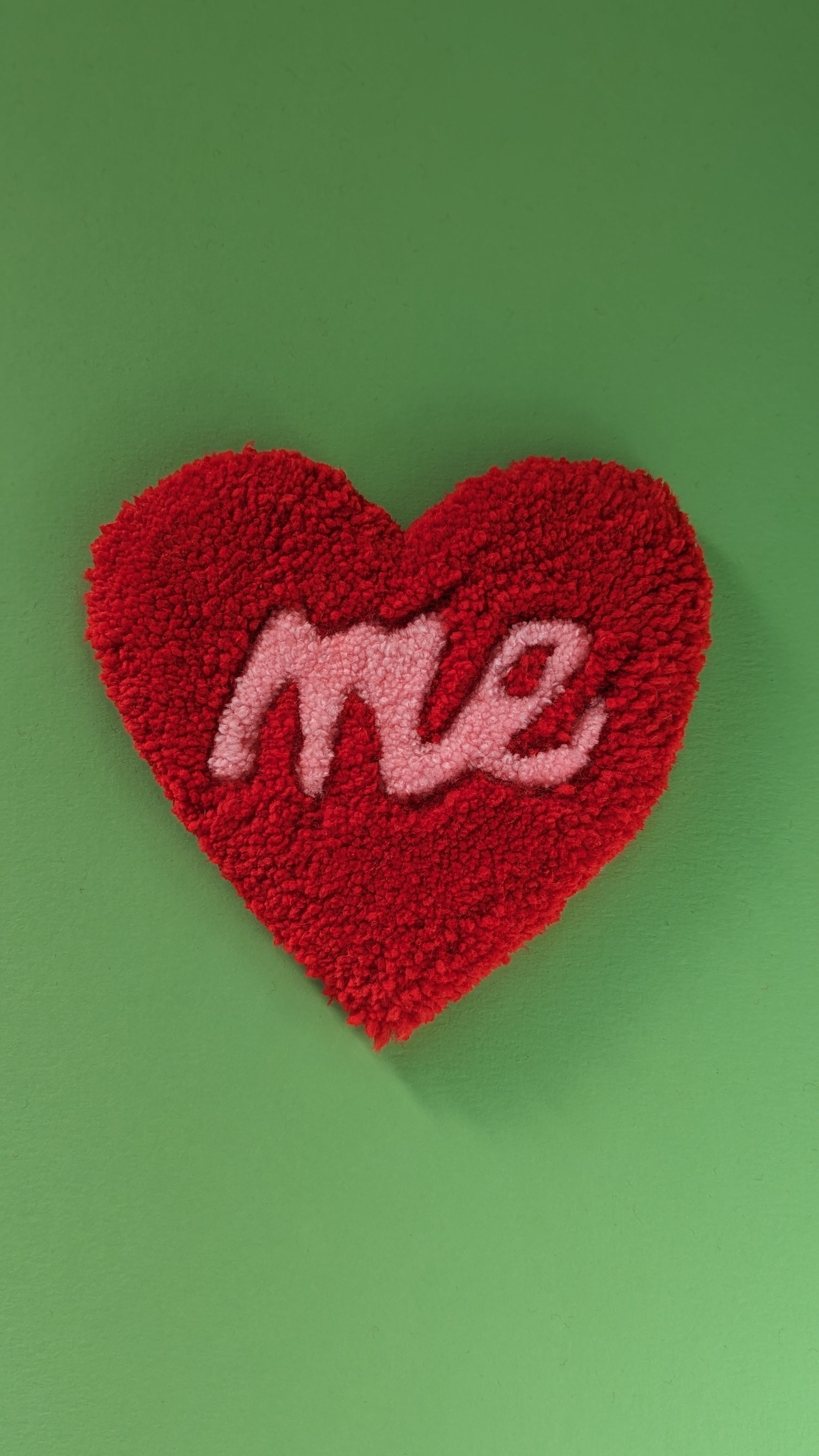 Bright red love heart shaped coaster with pink ME slogan mini rug mug rug