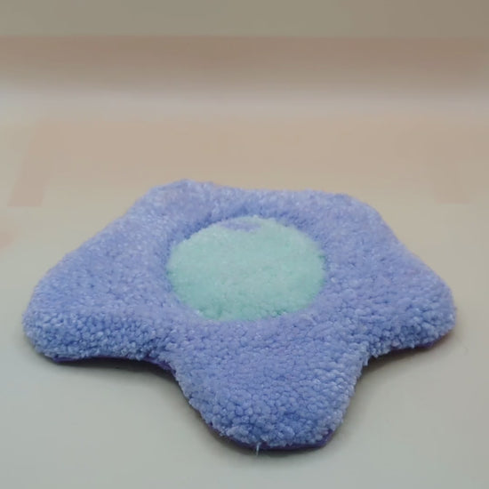 Bring a little joy to your coffee or tea ritual with this handmade purple and green fried egg shaped mug rug! Each piece is tufted with soft, high-quality acrylic yarn. Perfect for adding a pop of colour and personality to your space.
