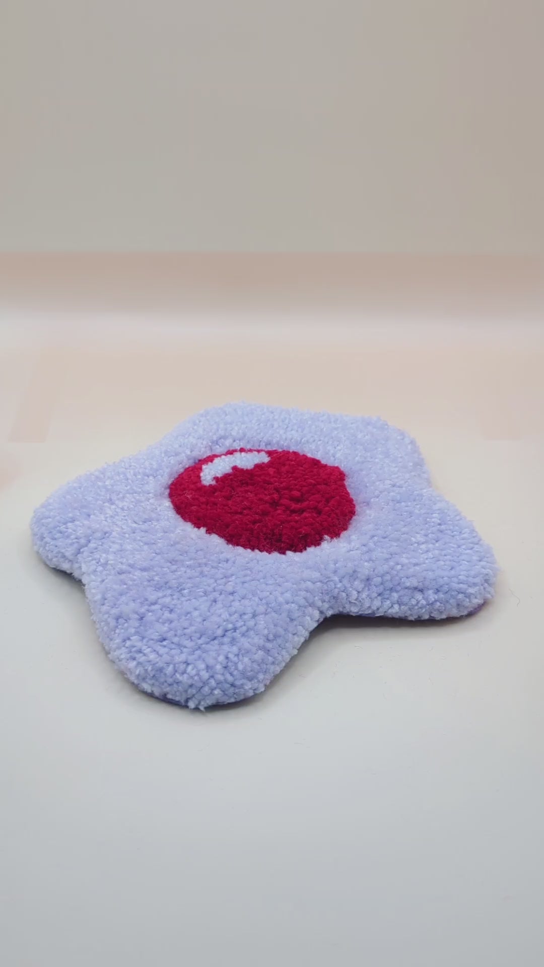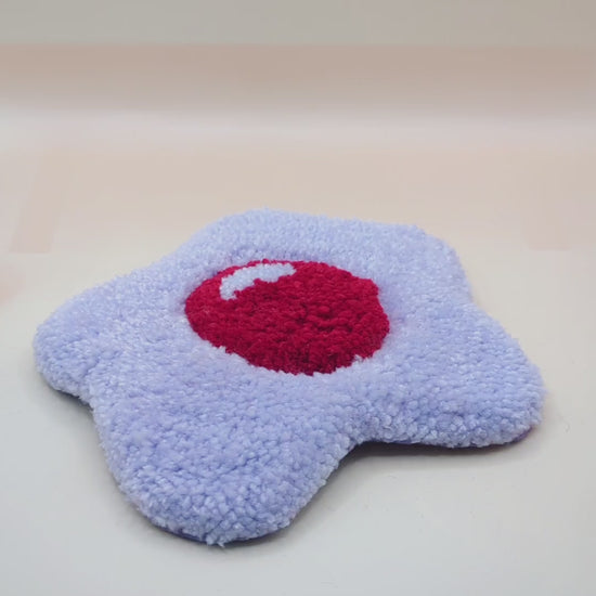 Bring a little joy to your coffee or tea ritual with this handmade purple and red fried egg shaped mug rug! Each piece is tufted with soft, high-quality acrylic yarn. Perfect for adding a pop of colour and personality to your space.