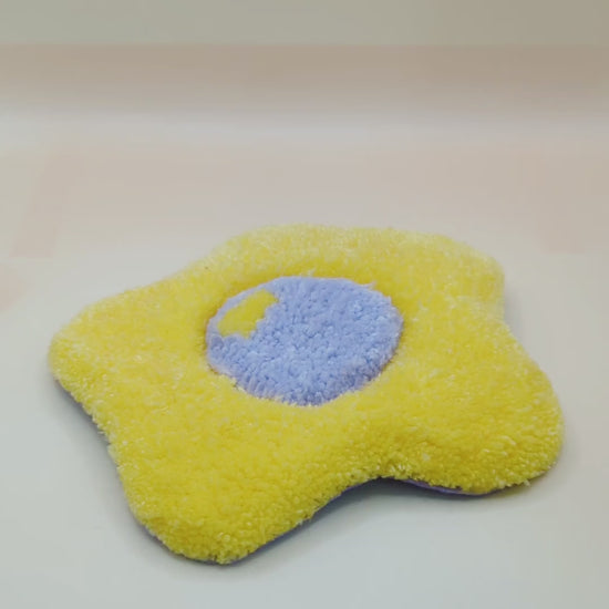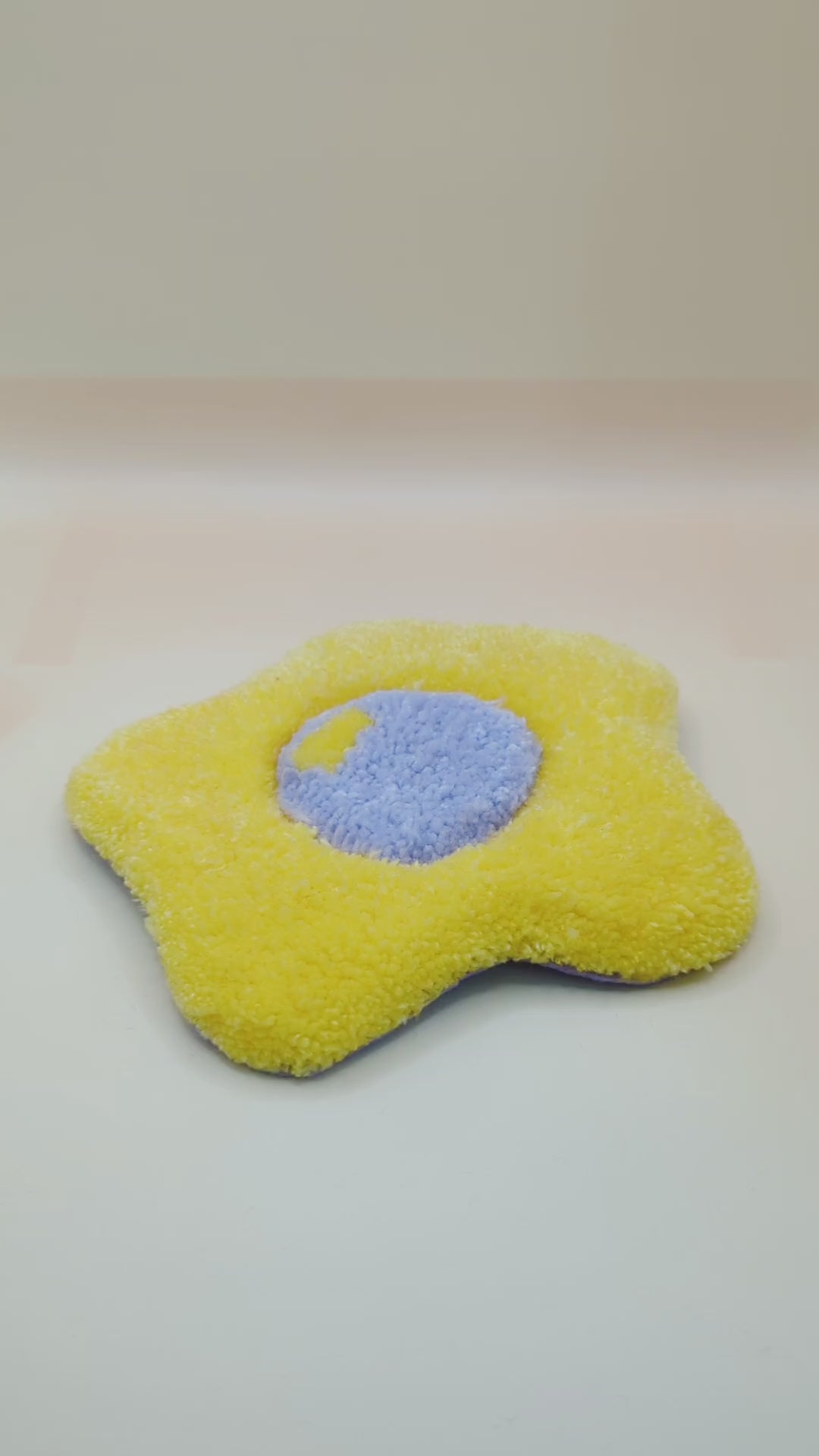 Bring a little joy to your coffee or tea ritual with this handmade yellow and purple fried egg shaped mug rug! Each piece is tufted with soft, high-quality acrylic yarn. Perfect for adding a pop of colour and personality to your space.