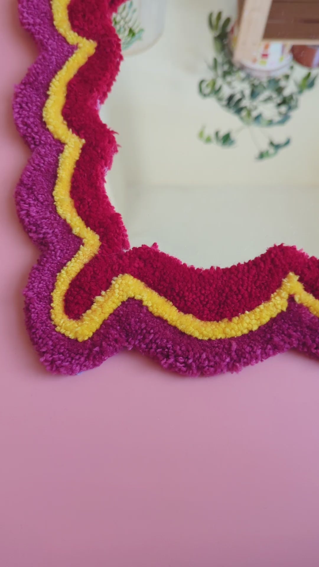 Pink, yellow and red coloured wavy pattern tufted yarn mirror
