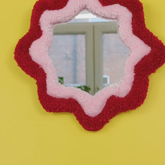 Handmade Wavy Red Pink Tufted Wall Mirror – Unique Wavy Organic Shape Accent Mirror for Bedrooms, Living Rooms & Creative Spaces